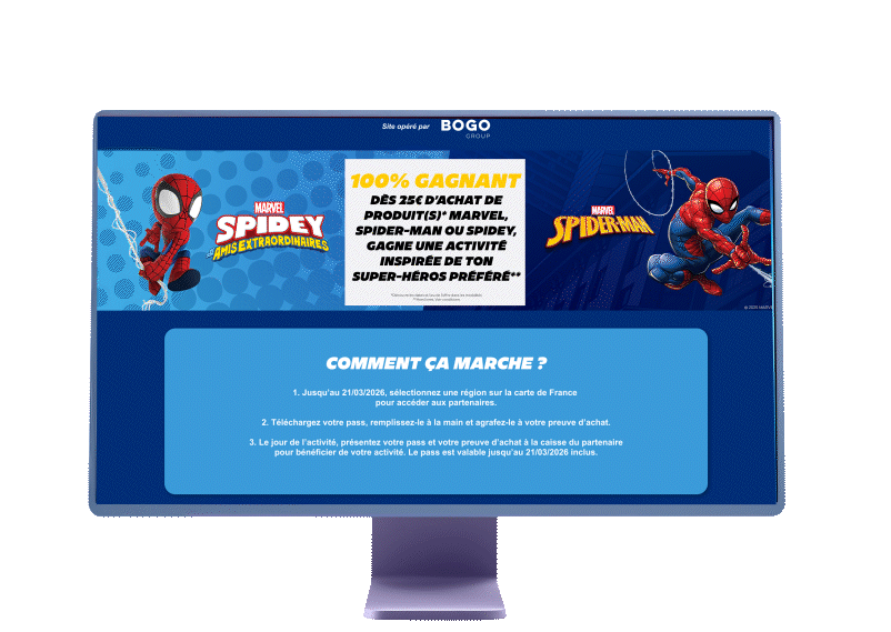 OFFRE : Dans le cadre d’un temps fort Disney Spiderman dans les magasins spécialisés, nous avons réalisé une opération permettant de gagner une « Spidey-activité » parmi un réseau de 200 partenaires à partir de 25€ d’achat de produits Spiderman ou Spidey.